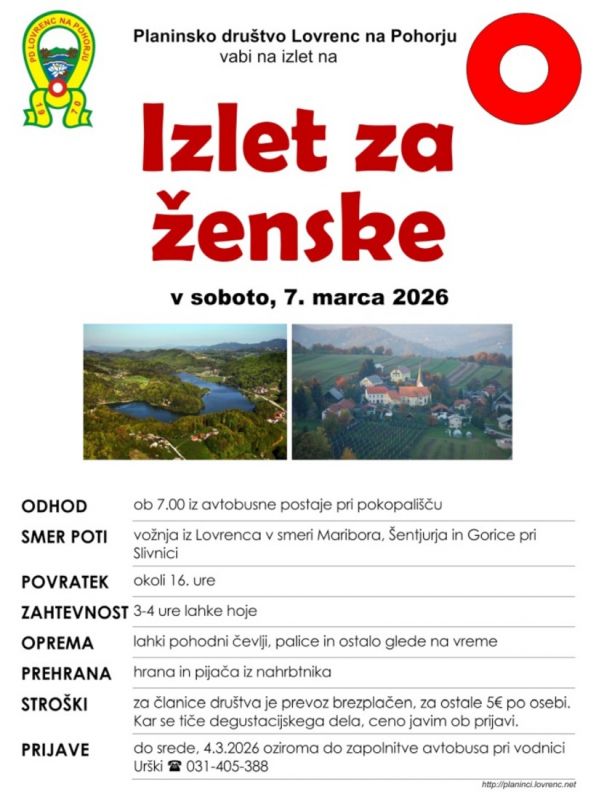 ODHOD: ob 7.00 iz avtobusne postaje pri pokopališču SMER POTI: vožnja iz Lovrenca v smeri Maribora, Šentjurja in Gorice pri Slivnici POVRATEK: okoli 16. ure ZAHTEVNOST: 3-4 ure lahke hoje... več